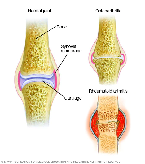 La artrosis hace que el cartílago, el tejido duro y resbaladizo que recubre los extremos de los huesos donde forma una articulación, se rompa. La artritis reumatoide es un trastorno autoinmunitario que afecta, en primer lugar, el revestimiento de las articulaciones (membrana sinovial).