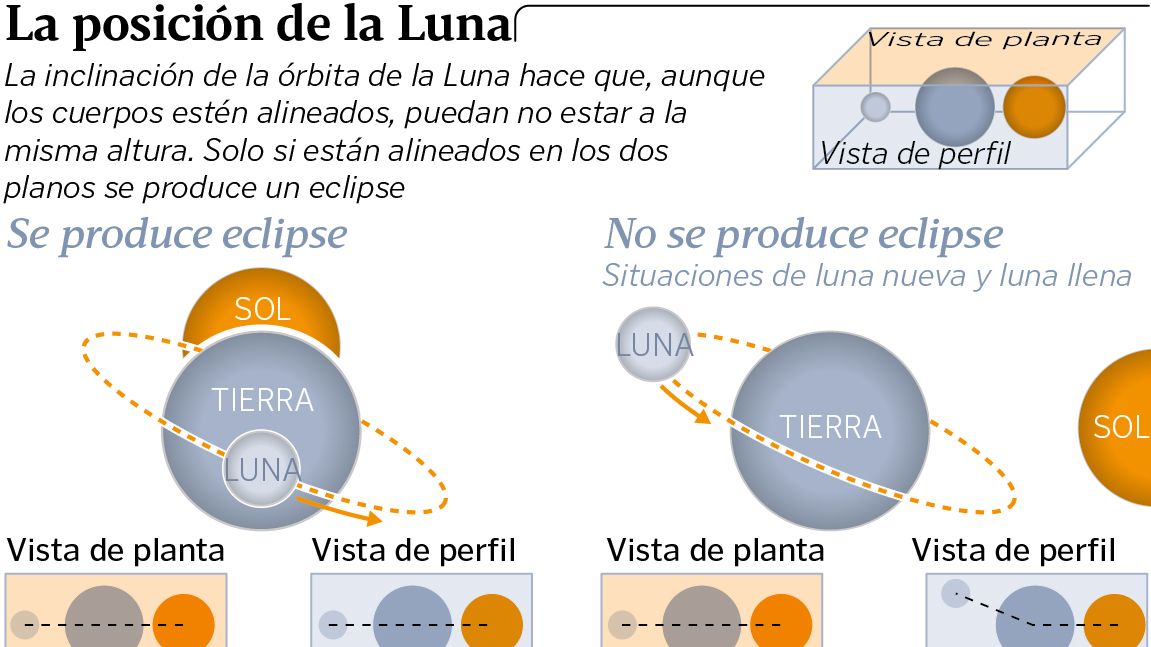 También se enseña que un eclipse es un fenómeno astronómico que ocurre cuando los tres objetos se encuentran alineados. Así que la pregunta surge de forma obligatoria. Si en ambos casos existe una alienación entre cuerpos. ¿Por qué no hay un eclipse lunar y otro solar cada mes? El secreto reside en que la alineación mensual, no se produce en el mismo plano. La Luna orbita con una inclinación de cinco grados y esto provoca casi siempre que pase por encima o por debajo de la sombra de nuestro planeta. Solo en determinadas ocasiones coinciden que estén alineados y que la Luna atraviese la sobre de la Tierra. Esto explica por qué los eclipse son eventos difíciles de presenciar.