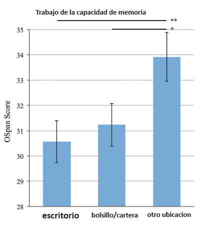 Figura: Experimento 1: efecto de la condición de ubicación del teléfono asignada aleatoriamente sobre la memoria de trabajo (WMC) disponible (OSpan Score, panel A) y el Gf funcional (Correctly Solved Raven’s Matrices, panel B). Los participantes en la condición de «escritorio» (alta prominencia) mostraron la capacidad cognitiva disponible más baja; aquellos en la condición de “otra ubicacion” (baja prominencia) mostraron la mayor capacidad cognitiva disponible. Las barras de error representan los errores estándar de las medias. Los asteriscos indican diferencias significativas entre condiciones, con * p < .05 y p < .01.