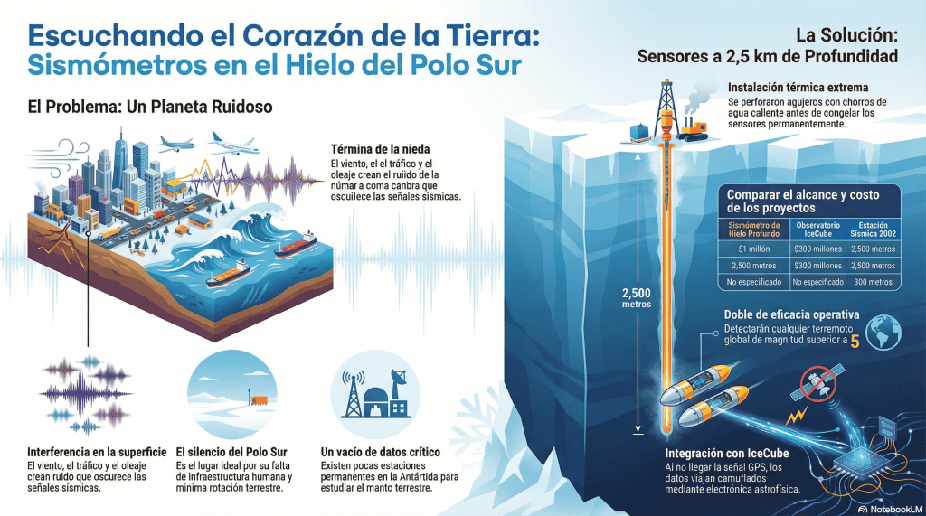 Este mes culminó la instalación de dos sismómetros de extrema sensibilidad a 2.5 kilómetros de profundidad en el hielo del Polo Sur, como parte del proyecto Sismómetro de Hielo Profundo del Servicio Geológico de Estados Unidos (USGS). Ubicados en el lugar más sísmicamente silencioso de la Tierra, estos sensores están diseñados para monitorear la estructura interna del planeta —el manto y el núcleo— y capturar los movimientos de la capa de hielo antártica, proporcionando datos cruciales sobre su contribución al aumento del nivel del mar. El proyecto, con un presupuesto de un millón de dólares, fue posible gracias a una colaboración estratégica con el Observatorio de Neutrinos IceCube, que permitió evitar millones en costos de perforación. A pesar de los desafíos técnicos, como la falta de señal GPS y el riesgo de desestabilización durante el congelamiento, los sensores ya están operativos, habiendo detectado su primer terremoto de magnitud 6.1, y se espera que alcancen su pleno rendimiento una vez que el agua circundante se congele por completo en aproximadamente un mes.