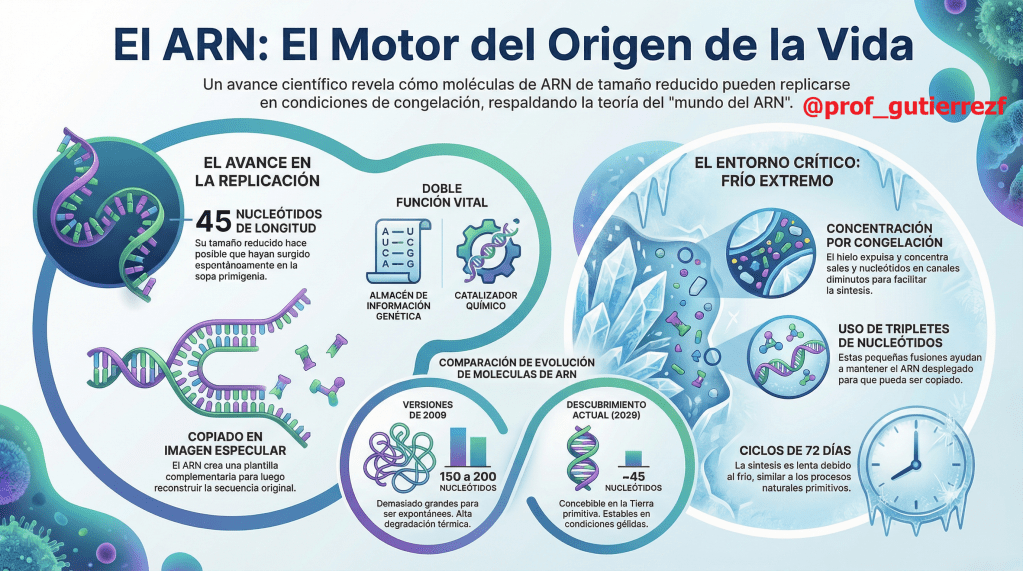 Un equipo de científicos ha logrado un avance significativo en la teoría del mundo de ARN al desarrollar moléculas capaces de generar copias de sí mismas mediante plantillas complementarias. A diferencia de intentos previos, estos nuevos ejemplares son mucho más pequeños y estables, lo que sugiere que podrían haberse formado de manera espontánea en la Tierra primitiva. El experimento se realizó en condiciones de congelación, un entorno que ayuda a concentrar los componentes químicos necesarios y evita la degradación del material genético. Aunque todavía no se ha observado un ciclo de replicación totalmente autónomo, el hallazgo demuestra que el ARN puede funcionar simultáneamente como almacén de información y catalizador. Este descubrimiento refuerza la hipótesis de que esta molécula fue el motor principal que impulsó el inicio de la evolución biológica. De confirmarse su eficiencia en ciclos repetidos, este sistema pasaría de ser una posibilidad teórica a una explicación altamente probable sobre el origen de la vida.