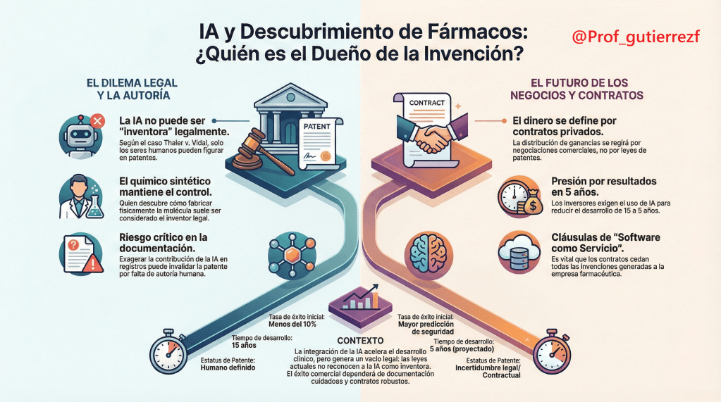 El descubrimiento de fármacos enfrenta un panorama de alto riesgo, con una tasa de fracaso superior al 90% para candidatos antes de llegar al mercado. La Inteligencia Artificial (IA) surge como una herramienta crítica para mitigar este «valle de la muerte», acelerando procesos y reduciendo costos. Sin embargo, su integración plantea interrogantes legales complejos sobre la propiedad intelectual (PI). Bajo el marco legal actual de EE. UU. (caso Thaler v. Vidal), una IA no puede ser reconocida como inventora; la invención requiere contribución humana. Esta brecha entre la capacidad tecnológica y la normativa vigente genera riesgos estratégicos, especialmente en la documentación de procesos y la redacción de contratos comerciales. La propiedad de las innovaciones futuras dependerá menos de la jurisprudencia inmediata y más de negociaciones privadas robustas y una gestión meticulosa de los cuadernos de laboratorio.