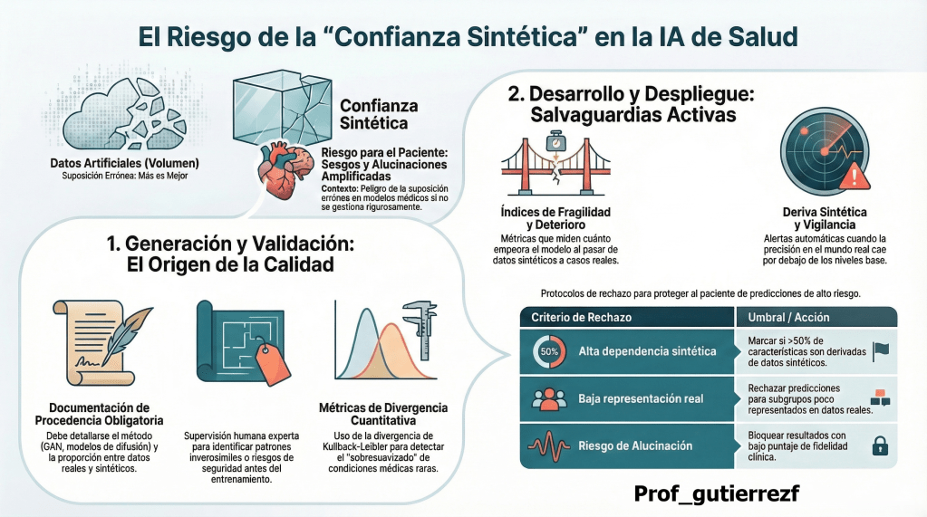 Este articulo analiza los peligros de la confianza sintética en el ámbito de la salud, advirtiendo que el uso masivo de datos artificiales no garantiza mejores modelos de inteligencia artificial. Los autores destacan que la dependencia de estos registros puede amplificar sesgos, generar errores clínicos y provocar el colapso de los modelos si no existe una regulación estricta. Se proponen estrategias críticas de supervisión, como el red-teaming por expertos y el uso de métricas de fidelidad para asegurar la validez de los diagnósticos. Además, el documento enfatiza que la calidad de la información es más importante que el volumen para proteger la seguridad del paciente. Finalmente, se recomienda una vigilancia continua tras el despliegue para detectar el deterioro del rendimiento frente a realidades médicas complejas.