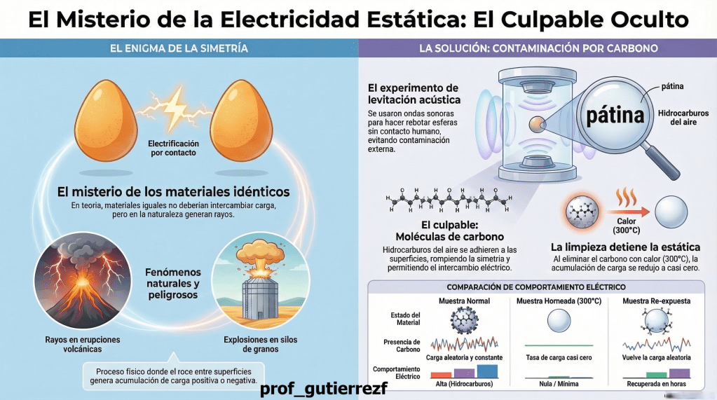 Un estudio publicado en la revista Nature en marzo de 2026 ha identificado la causa principal de un enigma científico de décadas: por qué materiales idénticos intercambian carga eléctrica al entrar en contacto. La investigación, liderada por Scott Waitukaitis del Instituto de Ciencia y Tecnología de Austria, revela que trazas microscópicas de contaminación superficial por moléculas de carbono provenientes del aire son las responsables de este fenómeno. Mediante experimentos de levitación acústica y limpieza térmica extrema, el equipo demostró que la eliminación de estos compuestos reduce la transferencia de carga a casi cero, mientras que su presencia rompe la simetría necesaria para la electrificación. Este hallazgo tiene implicaciones críticas no solo para comprender los rayos volcánicos y las explosiones en silos de grano, sino también para explicar la formación de planetas en discos protoplanetarios.