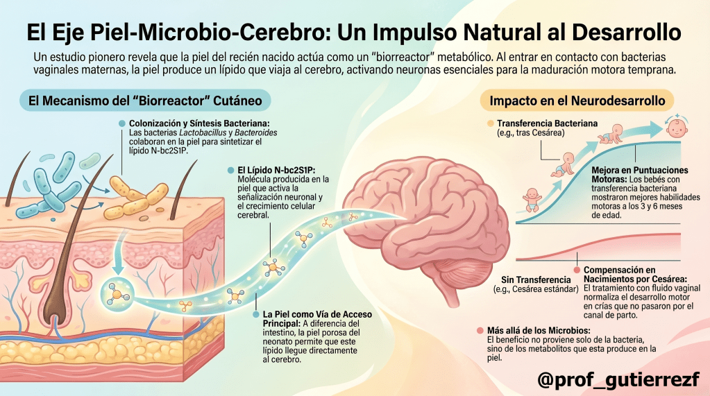 Este estudio concluye que la piel del recién nacido funciona como un reactor metabólico crítico que procesa la herencia microbiana materna para optimizar el desarrollo cerebral temprano.